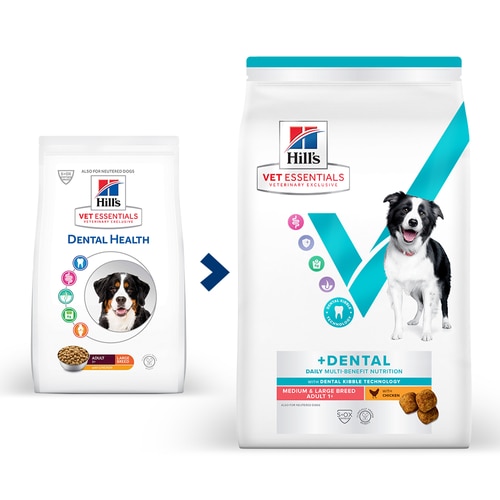Η Hill's VET ESSENTIALS MULTI-BENEFIT + DENTAL Ενήλικα 1+ τροφή για σκύλους διατίθεται αποκλειστικά από κτηνιάτρους και παρέχει πλήρη διατροφή με πολλαπλά οφέλη για σκύλους μεσαίας και μεγαλόσωμης φυλής, περιλαμβανομένης κλινικά αποδεδειγμένης Τεχνολογίας Κροκετών Φροντίδας των Δοντιών για να διατηρεί τα δόντια και τα ούλα υγιή. Οι μεγαλύτερες κροκέτες με φυτικές ίνες μίας κατεύθυνσης, βοηθούν στον καθαρισμό των δοντιών με δράση παρόμοια με οδοντόβουρτσας. Χωρίς τεχνητά συντηρητικά. Χωρίς συνθετικές χρωστικές. Χωρίς τεχνητά ενισχυτικά γεύσης.